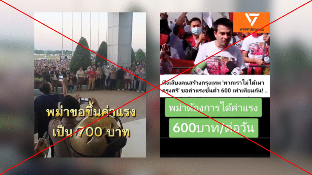 นี่เป็นเรื่องบิดเบือน องค์กรที่ทำงานด้านการตรวจสอบข้อเท็จจริงอย่าง Cofact และ AFP Fact Check พบว่าเป็นการนำคลิปเก่าของผู้นำแรงงานพม่าในไทยที่ให้สัมภาษณ์สื่อเมื่อ 4 ปีก่อนตอนที่ไทยยังไม่ขึ้นค่าแรงขั้นต่ำมาเผยแพร่ซ้ำทั้งในเฟซบุ๊กและติ๊กตอกโดยขาดบริบท แถมยังนำไปโยงกับภาพการรวมตัวของชาวพม่าในไทยครั้งอื่น ๆ ซึ่งไม่เกี่ยวข้องกับเรื่องค่าแรง ทำให้เกิดความเข้าใจผิดและปลุกปั่นความเกลียดชังว่าแรงงานพม่าเรียกร้องมาก