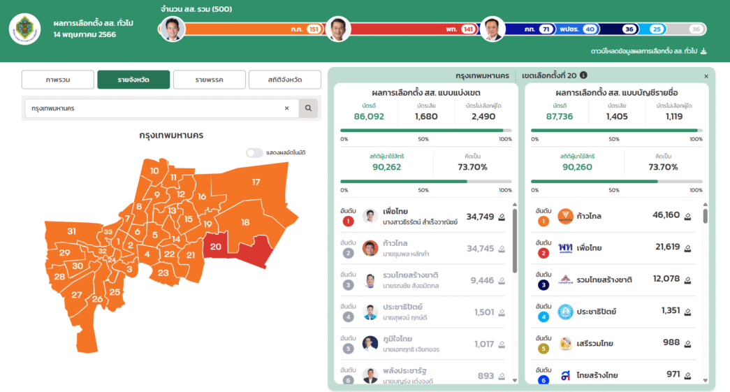 🔎 โคแฟคตรวจสอบ: จากฐานข้อมูลผลการเลือกตั้งปี 2566 ของ กกต. เขตเลือกตั้งที่ 20 กรุงเทพฯ ธีรรัตน์ สำเร็จวาณิชย์ จากพรรคเพื่อไทย เฉือนชนะชุมพลจากพรรคก้าวไกล 4 คะแนน โดยธีรรัตน์ได้ 34,749 คะแนน ชุมพลได้ 34,745 คะแนน มีผู้ออกมาใช้สิทธิ 73.70% ทำให้ลาดกระบังเป็นเขตเดียวในกรุงเทพฯ ที่ก้าวไกลแพ้การเลือกตั้ง
