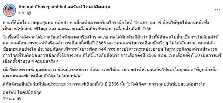 “หลังจากได้ปราศรัยเสร็จที่ตลาดเกรียงไกร คุณชุมพลได้ทักท้วงดิฉันว่า สิ่งที่ดิฉันพูดไปนั้น เป็นการใช้ถ้อยคำที่คลาดเคลื่อน เพราะแท้ที่จริงแล้ว การเลือกตั้งเมื่อปี 2566 คุณชุมพลแพ้ในการเลือกตั้งจริง ๆ ไม่ได้เกิดจากการถูกปล้นชัยชนะแต่อย่างใด ประกอบกับคุณพิจารณ์ เชาวพัฒนวงศ์ กรรมการบริหารพรรคประชาชน ในฐานะอดีตรองหัวหน้าพรรคก้าวไกลที่รับผิดชอบการเลือกตั้งในกรุงเทพ ก็ได้ชี้แจงกับดิฉันว่า การเลือกตั้งปี 2566 กทม. เขตเลือกตั้งที่ 20 เป็นการแพ้เลือกตั้งจำนวน 4 คะแนนจริง ๆ” อมรรัตน์โพสต์ข้อความในเฟซบุ๊ก “Amarat Chokepamitkul อมรัตน์ โชคปมิตต์กุล”