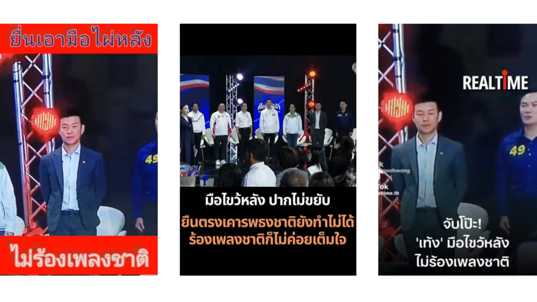 ❓ เนื้อหาที่ตรวจสอบ: หัวหน้าพรรคประชาชนยืนเอามือไพล่หลัง-ไม่ร้องเพลงชาติบนเวทีดีเบต