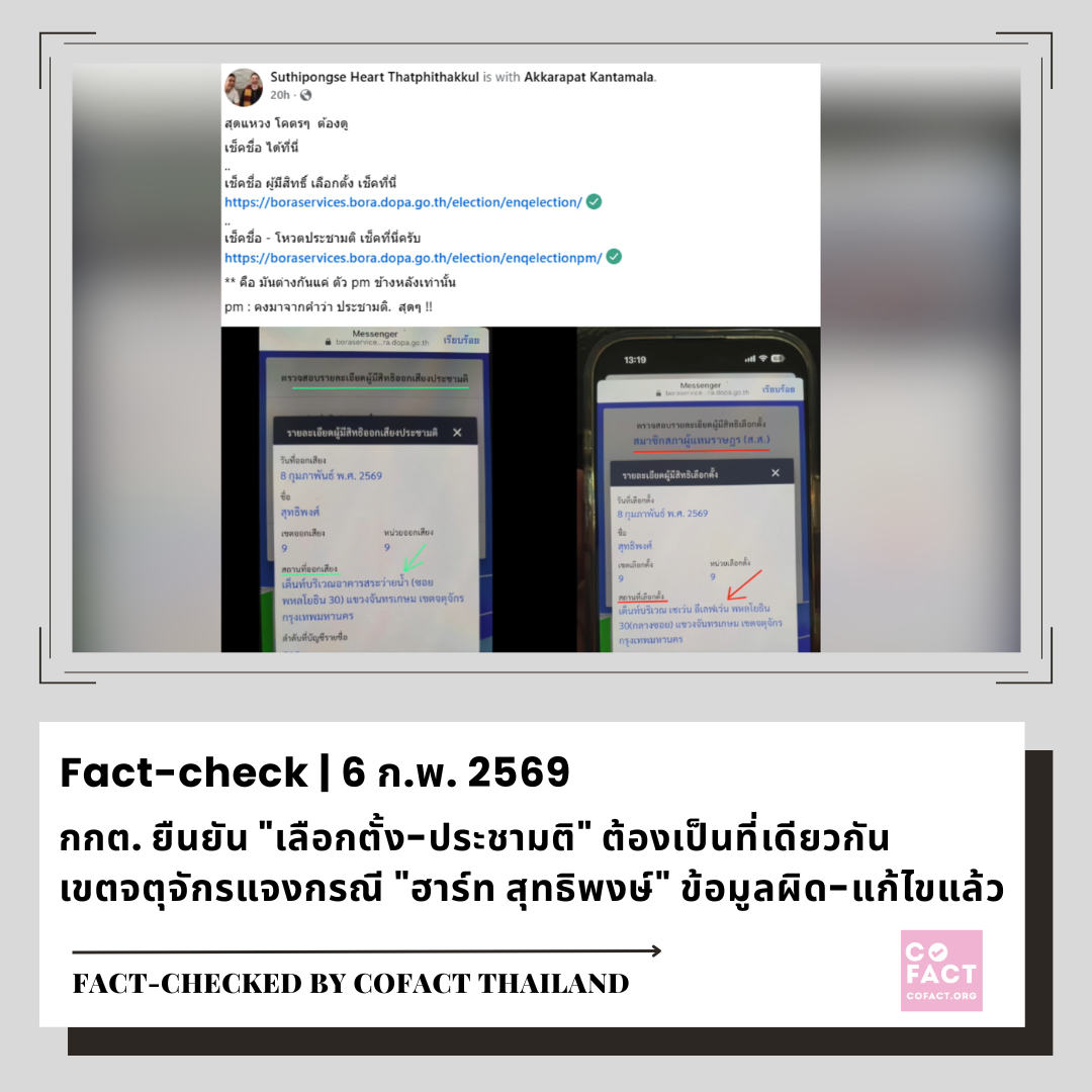 ❓ เนื้อหาที่ตรวจสอบ: หน่วยเลือกตั้ง สส. กับหน่วยออกเสียงประชามติอยู่คนละที่
