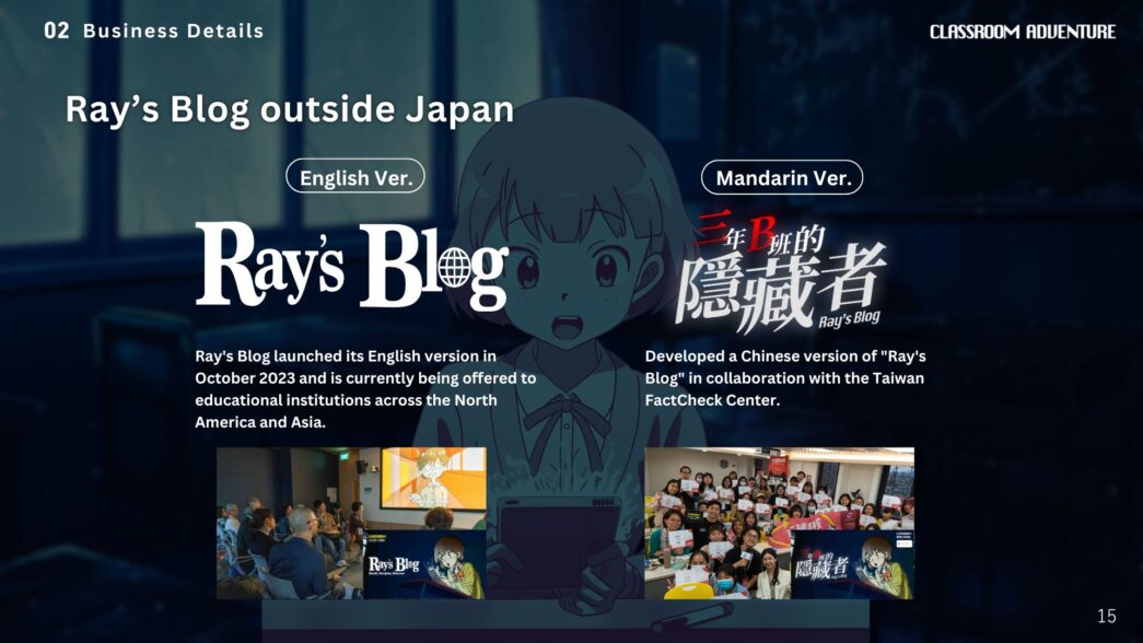 Classroom Adventure เป็นโปรเจกต์ที่โนอาร่วมทำกับเพื่อน ๆ มหาวิทยาลัย Keio พัฒนาเกมที่ให้ผู้เล่นพัฒนาทักษะการตรวจสอบข้อมูลออนไลน์ ปัจจุบันเกม Ray’s Blog มีการแปลเป็นภาษาอังกฤษและจีน และนำไปให้เด็ก ๆ ในหลายประเทศได้เล่นและเรียนรู้