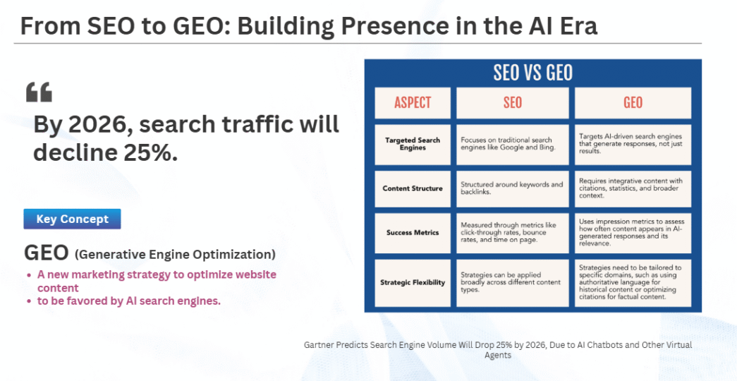 จากเดิมที่ผู้ผลิตเนื้อหาต้องให้ความสำคัญกับ Search Engine Optiminzation หรือการทำให้ search engine แนะนำเนื้อหาของตน สิ่งที่ต้องให้ความสนใจตอนนี้กลายเป็น GEO–Generative Engine Optimization เพื่อให้ AI มองเห็นเนื้อหาและนำไปแสดงผล
