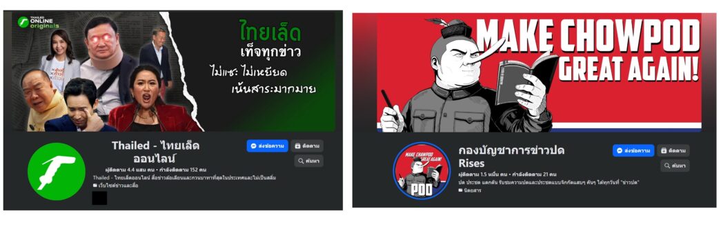 ตัวอย่างในประเทศไทยที่หลายคนน่าจะเคยผ่านตา เช่น “ข่าวปด” ซึ่งตั้งชื่อล้อเลียน นสพ.ข่าวสด ในอดีตเคยมีเพจเฟซบุ๊กและเคยปรากฏเป็นข่าวถูกฟ้องในปี 2562 และมีรายงานว่าเพจหายไปจากสารบบของเฟซบุ๊ก อย่างไรก็ตาม ปัจจุบันเพจดังกล่าวได้กลับมาเปิดใหม่ในชื่อ “กองบัญชาการข่าวปด Rises” โดยหากดูในส่วนของช่องทางแพลตฟอร์มอื่นๆ เช่น บัญชี X “ข่าวปด-Khaopod” และช่องยูทูบ “ข่าวปด TV” จะยังพอเห็นร่องรอยของเพจข่าวปดเดิมได้อยู่ หรือเพจ “Thailed – ไทยเล็ดออนไลน์” ที่ทั้งชื่อและโลโก้เพจล้อเลียนเพจทางการของนสพ.ไทยรัฐ เป็นต้น