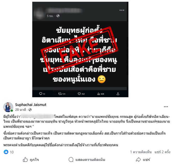 อย่างในภาพข้างต้นนี้ เป็นข่าวที่รายงานเมื่อวันที่ 18 ม.ค. 2569 โดย ศุภชัย ใจสมุทร ผู้สมัคร สส.บัญชีรายชื่อ และประธานคณะทำงานด้านกฎหมาย พรรคภูมิใจไทย ประกาศจะดำเนินคดีกับผู้เผยแพร่ข้อมูลเท็จ กรณีโพสต์ข้อความอ้างว่า นพ.ชัยยุทธ กรรณสูต ผู้ก่อตั้งบริษัททอิตาเลียน-ไทย เป็นพี่ชายของมารดา อนุทิน ชาญวีรกูล หัวหน้าพรรคภูมิใจไทย นายอนุทินจึงเป็นหลานชายแท้ๆ ของ นพ.ชัยยุทธ
