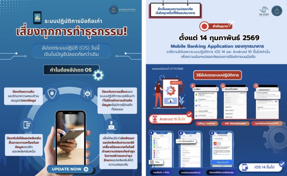 ในวันที่ 27 พ.ย. 2568 สมาคมธนาคารไทย เผยแพร่เนื้อหาเพิ่มเติมว่า ตั้งแต่ 14 ก.พ. 2569 แอปฯ Mobile Banking ของทุกธนาคารจะรองรับเฉพาะอุปกรณ์ที่ใช้ iOS14 และ Android10 ขึ้นไป เท่านั้นการอัปเดตระบบปฏิบัติการไม่เพียงช่วยปิดจุดเสี่ยงทางไซเบอร์ แต่ยังเป็นเกราะป้องกันภัยไซเบอร์ ช่วยลดความเสี่ยงจากมัลแวร์ ฟิชชิง และการโจมตีข้อมูลส่วนตัว ให้ทุกธุรกรรมทางการเงินของคุณปลอดภัยยิ่งขึ้น