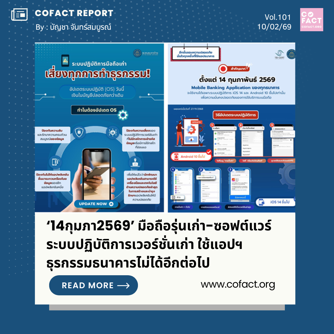 สืบเนื่องจากมีผู้สอบถามเข้ามาในระบบของ Cofact เป็นระยะๆ กรณีมีการแชร์เนื้อหากันในสื่อสังคมออนไลน์ ว่าในวันที่ 14 ก.พ. 2569 โทรศัพท์มือถือรุ่นเก่าจะไม่สามารถใช้แอปพลิเคชั่น Mobile Banking ได้อีกต่อไปนั้นเป็นข่าวจริงหรือไม่? ผู้เขียนจึงได้รวบรวมที่มาที่ไปของเรื่องราวนี้มาย้ำเตือนอีกครั้งเพื่อให้ผู้ใช้งาน Mobile Banking รีบอัปเดตเวอร์ชั่นระบบปฏิบัติการโทรศัพท์มือถือ (หรืออาจต้องซื้อโทรศัพท์มือถือเครื่องใหม่หากไม่สามารถอัปเดตได้) เพื่อลดความเสี่ยง!!!