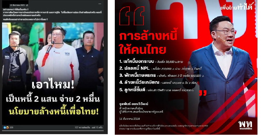 https://blog.cofact.org/th/political-fact-check-pheuthai-25122025/ (ผู้ใช้เฟซบุ๊ก-X เผยแพร่เนื้อหาที่สร้างความเข้าใจคลาดเคลื่อนต่อ “นโยบายล้างหนี้” ของพรรคเพื่อไทย : โคแฟค 25 ธ.ค. 2568)