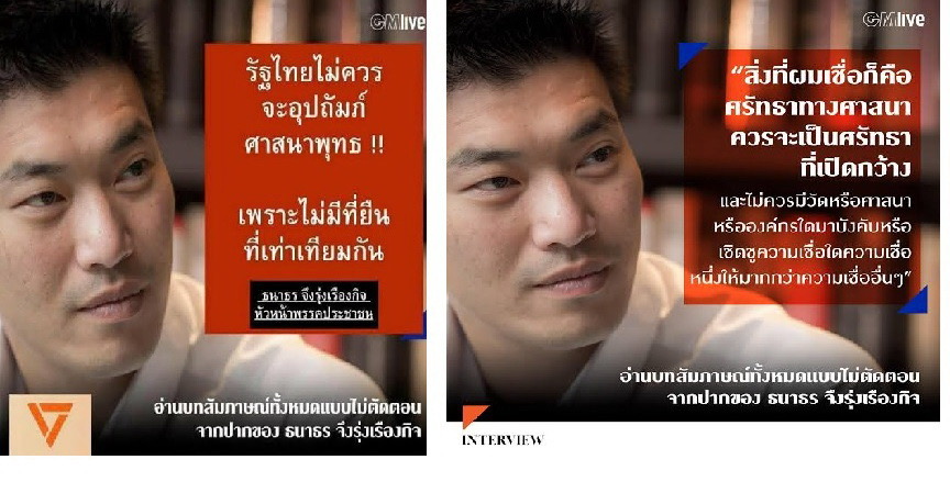 ขณะที่โพสต์ตัดทอนคำพูดของธนาธรที่นำมาเผยแพร่ในปี 2569 ระบุสั้นๆ เพียง “รัฐไทยไม่ควรจะอุปถัมภ์ศาสนาพุทธ!! เพราะไม่มีที่ยืนที่เท่าเทียมกัน อีกทั้งยังกล่าวอ้างเท็จว่าธนาธรเป็นหัวหน้าพรรคประชาชน ซึ่งกำลังอยู่ในช่วงหาเสียงเลือกตั้ง 8 ก.พ. 2569 โดยในความเป็นจริง หัวหน้าพรรคประชาชนคือ ณัฐพงษ์ เรืองปัญญาวุฒิ ส่วนธนาธรยังอยู่ในช่วงถูกตัดสิทธิ์ลงสมัครรับเลือกตั้งเป็นเวลา 10 ปี จากคดียุบพรรคอนาคตใหม่เมื่อปี 2563