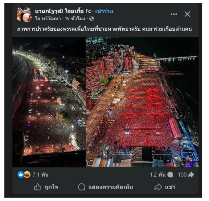 4. False Context (เนื้อหาที่ไม่ตรงบริบทหรือบริบทปลอม) : ข้อมูลจริงแต่ถูกนำมาใช้ผิดกาลเทศะหรือผิดบริบทเพื่อให้คนเข้าใจไปอีกทาง มีตัวอย่างวันที่ 1 ก.พ. 2569 ในกลุ่มเฟซบุ๊กของผู้สนับสนุนพรรคเพื่อไทย มีการโพสต์ภาพผู้คนเนืองแน่นเต็มชายหาดยามค่ำคืน อ้างว่าเป็นประชาชนมาฟังปราศรัยของแกนนำและผู้สมัคร สส. พรรคเพื่อไทย ที่หาดพัทยา จ.ชลบุรี แต่เมื่อตรวจสอบพบว่าทั้ง 2 ภาพ เป็นภาพเก่าจากประเทศบราซิล โดยภาพซ้ายเป็นภาพการแสดงคอนเสิร์ตของเลดี้กาก้า ที่ชายหาดโคปาคาบานา เมืองริโอ เดอ จาเนโร เมื่อช่วงค่ำวันที่ 3 พ.ค. 2568 ส่วนภาพขวาเป็นภาพคอนเสิร์ตของ Alok ศิลปินและดีเจชื่อดังชาวบราซิล ที่ชายหาดในเมืองฟอร์ตาเลซา ในงานเคาท์ดาวน์ส่งท้ายปีเก่า 31 ธ.ค. 2566 – ต้อนรับปีใหม่ 1 ม.ค. 2567