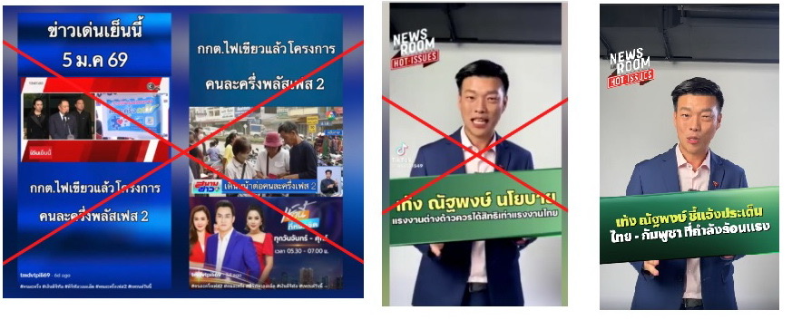 ภาพที่ 5 (ซ้าย) คลิปแอบอ้างเป็นสำนักข่าว อ้าง กกต. อนุมัติโครงการคนละครึ่งพลัสเฟส 2 ช่วงวันที่ 5 และ 8 ม.ค. 2569 , (กลาง) คลิปแอบอ้างเป็น ณัฐพงษ์ เรืองปัญญาวุฒิ หัวหน้าพรรคประชาชน บอกว่าพรรคมีนโยบายแรงงานต่างด้าวควรได้สิทธิเท่าแรงงานไทย ช่วงวันที่ 7 ก.พ. 2569 , (ขวา) คลิปจริงจากสำนักข่าวไทยรัฐ ณัฐพงษ์ เรืองปัญญาวุฒิ พูดถึงสถานการณ์ชายแดนไทย – กัมพูชา วันที่ 4 มิ.ย. 2568)
