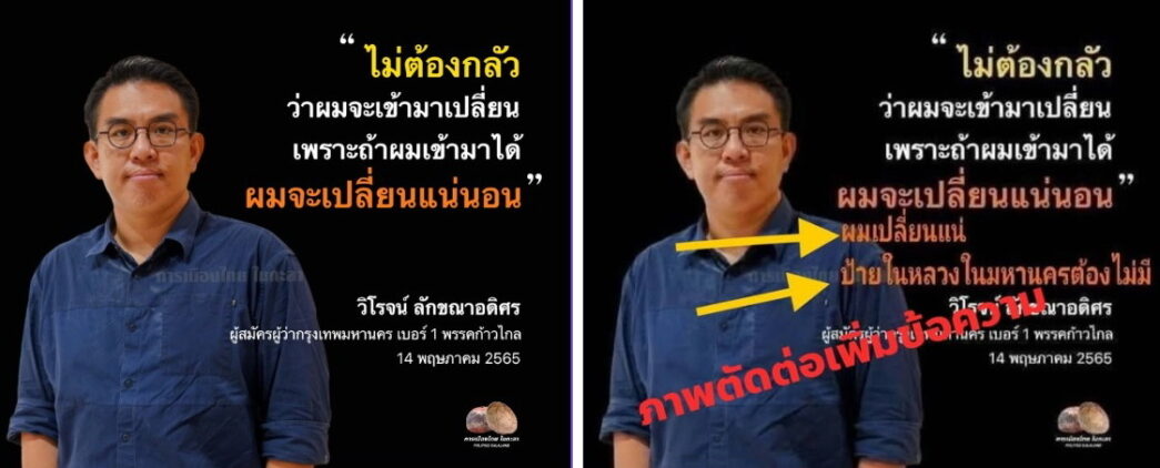 6.Manipulated Content (เนื้อหาตัดต่อบิดเบือน): ข้อมูลจริง (เช่น ภาพหรือวิดีโอ) ถูกนำมาแก้ไข ตัดต่อ เพื่อหลอกลวงคนดู มีตัวอย่างที่โคแฟคเผยแพร่ไปเมื่อวันที่ 15 ม.ค. 2569 กรณีภาพของ วิโรจน์ ลักขณาอดิศร ผู้สมัคร สส. บัญชีรายชื่อ พรรคประชาชน ฝังข้อความว่า “ไม่ต้องกลัวว่าผมจะเปลี่ยน เพราะถ้าผมเข้ามาได้ ผมเปลี่ยนแน่นอน ผมเปลี่ยนแน่ ป้ายในหลวงในมหานครต้องไม่ม