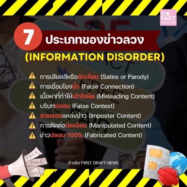 https://blog.cofact.org/th/7informatiindisorder69/ (รู้จัก!7 ประเภทข่าวลวง (Information Disorder) ตามเกณฑ์ของ First Draft News : Cofact 3 ก.พ. 2569)
