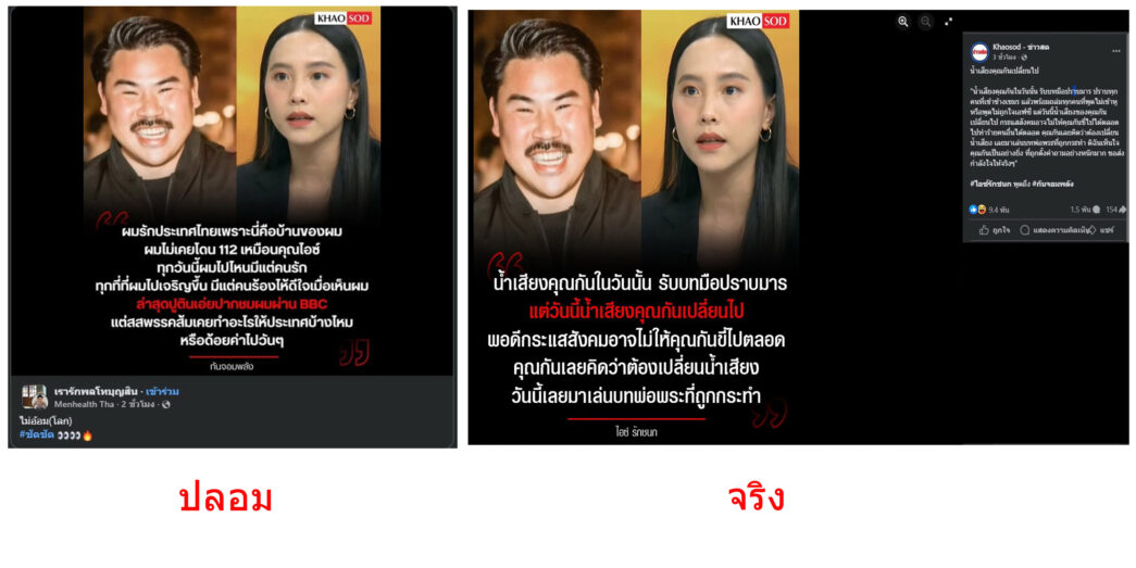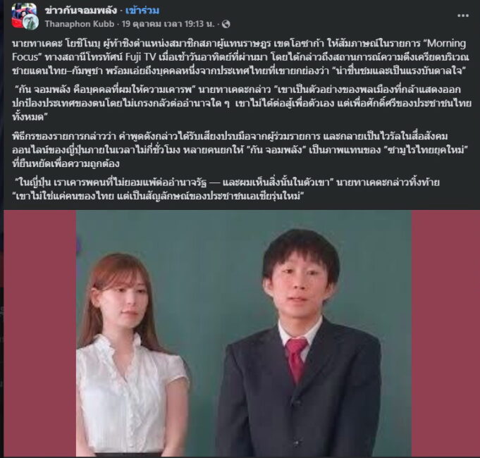 ในวันที่ 20 ต.ค. 2568 บัญชีเฟซบุ๊ก “Menhealth Tha” โพสต์ภาพในกลุ่มเฟซบุ๊ก “เรารักพลโทบุญสิน” เป็นภาพของ กัน จอมพลัง อินฟลูเอนเซอร์ กับ ไอซ์ รักชนก สส. พรรคประชาชน และมีโลโก้ของ “KHAOSOD” หรือ นสพ.ข่าวสด อยู่บริเวณหัวมุมด้านขวา ขณะที่ในภาพฝังข้อความว่า “ผมรักประเทศไทยเพราะนี่คือบ้านของผม ผมไม่เคยโดน 112 เหมือนคุณไอซ์ ทุกวันนี้ผมไปไหนมีแต่คนรัก ทุกที่ที่ผมไปเจริญขึ้น มีแต่คนร้องไห้ดีใจเมื่อเห็นผม ล่าสุดปูตินเอ่ยปากชมผมผ่าน BBC แต่สสพรรคส้มเคยทำอะไรให้ประเทศบ้างไหม หรือด้อยค่าไปวันๆ”