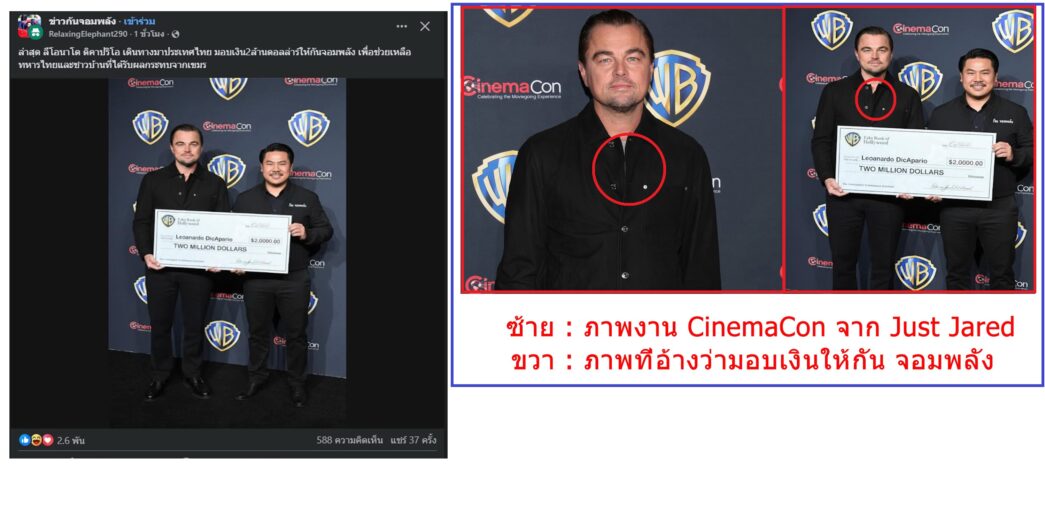 เช่นเดียวกับบัญชีแพลตฟอร์ม X ชื่อ “Leonardo DiCaprio Fan” ซึ่งเป็นบัญชีของกลุ่มแฟนคลับของลีโอนาร์โด ดิคาปริโอ ก็โพสต์ภาพและข่าวเดียวกันเมื่อวันที่ 2 เม.ย. 2568 และหากสังเกตที่กระดุมเสื้อของลีโอนาร์โด ดิคาปริโอ ในงานดังกล่าว จะพบว่าตรงกับภาพที่อ้างว่ามามอบเงิน 2 ล้านดอลลาร์ให้กัน จอมพลัง อีกทั้งโลโก้ WB บนฉากหลัง ยังเป็นโลโก้ของ Warner Bros. บริษัทภาพยนตร์ยักษ์ใหญ่ในสหรัฐฯ ซึ่งเป็นผู้จัดจำหน่ายภาพยนตร์เรื่อง One Battle After Another
