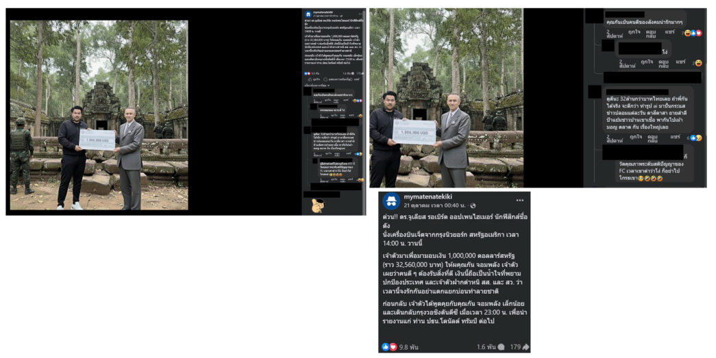 – ดาราฮอลลีวู้ด “ลีโอนาร์โด ดิคาปริโอ” บินด่วนมาไทยเพื่อบริจาคเงินให้กัน จอมพลัง : ภาพนี้ผู้เขียนพบในกลุ่มเฟซบุ๊ก “ข่าวกันจอมพลัง” โดยผู้ใช้ชื่อว่า “RelaxingElephant290” โพสต์ไว้เมื่อวันที่ 20 ต.ค. 2568 ว่า “ล่าสุด ลีโอนาโด ดิคาปริโอ เดินทางมาประเทศไทย มอบเงิน 2 ล้านดอลลาร์ให้กันจอมพลัง เพื่อช่วยเหลือทหารไทยและชาวบ้านที่ได้รับผลกระทบจากเขมร” อย่างไรก็ตาม ผู้เขียนเห็น“ความผิดปกติในภาพ” เช่น ชื่อของนักแสดงในภาพเขียนว่า Leoanardo DicApario ซึ่งที่ถูกต้องคือ Leonardo Dicaprio , ตัวเลข 2 ล้านในภาพคือ2,0000.00 ซึ่งหากเขียนให้ถูกต้องคือ 2,000,000 , ชื่อ Faks Bank of Hollywood เมื่อนำไปค้นหาจะไม่พบข่าวหรือชื่อของธนาคารนี้