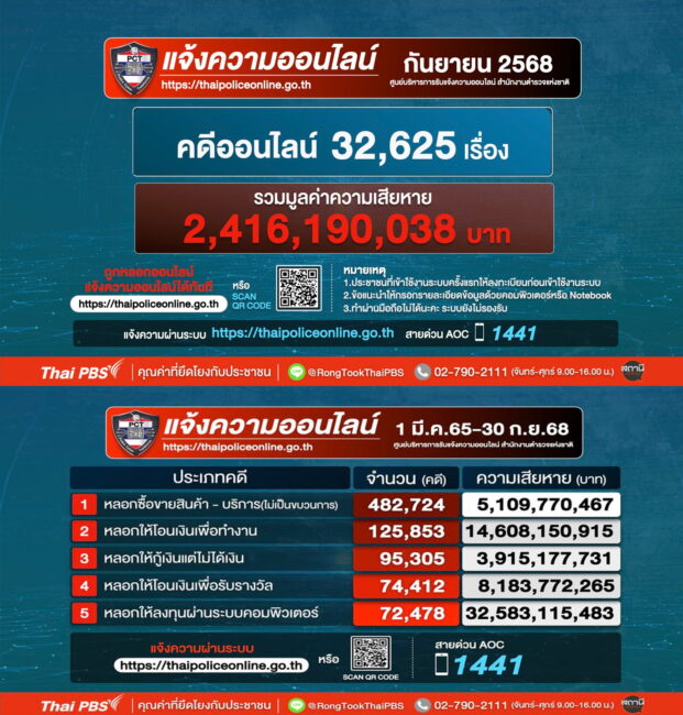 ไม่ใช่เรื่องที่น่ายินดีเลยกับคำว่า “ทะลุล้าน” ในครั้งนี้ สำหรับสถิติการแจ้งความออนไลน์ซึ่งเปิดเผยโดย สำนักงานตำรวจแห่งชาติ โดยนับตั้งแต่วันที่ 1 มี.ค. 2565 ที่เปิดระบบแจ้งความออนไลน์ จนถึง ณ วันที่ 30 ก.ย. 2568 มีการแจ้งความทั้งหมด 1,058,056 เรื่อง รวมมูลค่าความเสียหาย 100,408,016,872 บาท และเมื่อดูประเภทของการหลอกลวง จะพบว่า 4 ใน 5 อันดับ เป็นเรื่องของ“ขบวนการฉ้อโกงทางโทรคมนาคม” (สแกมเมอร์หรือแก๊งคอลเซ็นเตอร์) ทั้งสิ้น