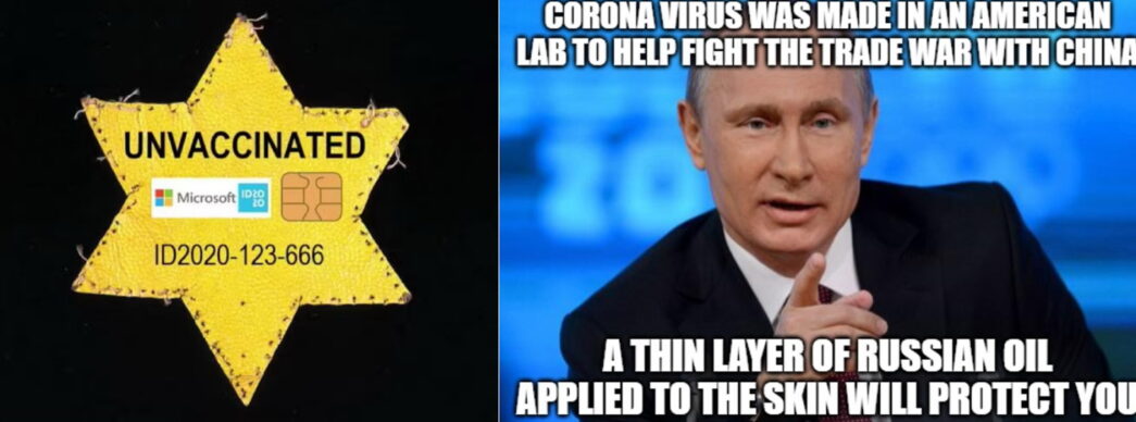 ภาพที่ 4 : (ซ้าย) มีมเปรียบเทียบชาวยิว (ใช้สัญลักษณ์ดาวหกแฉก) ในยุคสมัยที่ถูกฆ่าล้างเผ่าพันธุ์กับผู้ที่เลือกไม่ฉีดวัคซีน , (ขวา) มีมอ้างไวรัสโควิด-19 ถูกสร้างในสหรัฐอเมริกาเพื่อใช้เป็นอาวุธต่อสู้กับจีน และการทาน้ำมันรัสเซีย (ใช้ภาพของ วลาดิเมียร์ ปูติน ประธานาธิบดีรัสเซีย) สามารถช่วยป้องกันเชื้อได้