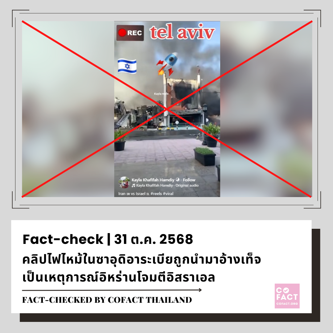–  วันที่ 2 5  ก.ค. 2568  พบ 1 ข่าว คือ โพสต์ปลอมอ้าง  “ ชาวกัมพูชาแตกตื่นหลังถูกเครื่องบินรบไทยถล่ม ที่แท้คลิปตึก สตง. ถล่ม  : คลิป TikTok อ้างชาวกัมพูชาวิ่งหนีเอาชีวิตรอดจากเครื่องบิน F-16 และ JAS 39 Gripen ซึ่งมีผู้เข้าชมกว่า 1.7 ล้านครั้งแต่เมื่อตรวจสอบองค์ประกอบโดยรอบ (เช่น อาคารสิ่งก่อสร้าง) พบว่าเป็นบริเวณตลาดย่านจตุจักร ในพื้นที่กรุงเทพฯ ประเทศไทย และบรรยากาศที่เหมือนฝุ่นตลบคล้ายอะไรบางอย่างถล่มลงมานั้นเป็นเหตุการณ์ตึกสำนักงานตรวจเงินแผ่นดิน (สตง.) ซึ่งกำลังก่อสร้างอยู่ในบริเวณใกล้เคียง ถล่มลงมาเมื่อวันที่ 28 มี.ค. 2568 (ค้นหาภาพด้วย Google Lens , เปรียบเทียบกับ Streer View ใน Google Map)