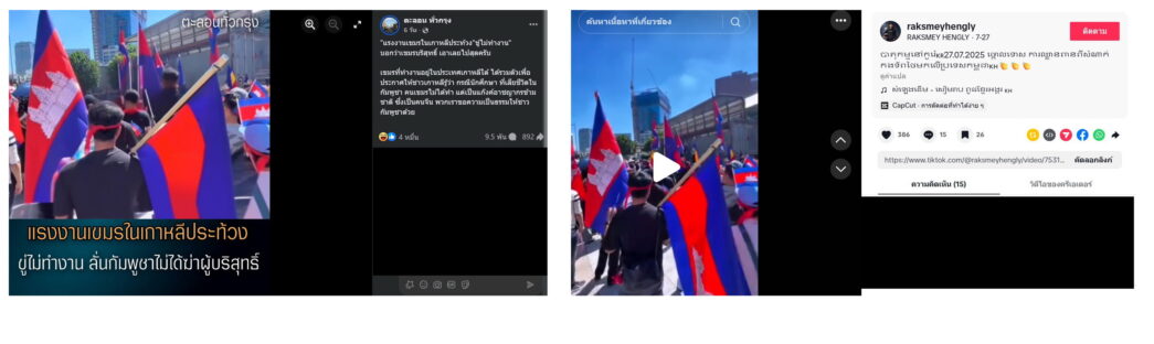 อีกตัวอย่างหนี่งคือเมื่อวันที่ 15 ต.ค. 2568 เพจเฟซบุ๊ก “ตะลอน ทั่วกรุง” โพสต์ภาพกลุ่มชาวกัมพูชาถือธงชาติ พร้อมข้อความในภาพระบุว่า “แรงงานเขมรในเกาหลีประท้วง ขู่ไม่ทำงาน ลั่นกัมพูชาไม่ได้ฆ่าผู้บริสุทธิ์” และบรรยายเพิ่มเติมว่า “แรงงานเขมรในเกาหลีประท้วง”ขู่ไม่ทำงาน” บอกว่าเขมรบริสุทธิ์ เอาเลยไปสุดครับ เขมรที่ทำงานอยู่ในประเทศเกาหลีใต้ ได้รวมตัวเพื่อประกาศให้ชาวเกาหลีรู้ว่า กรณีนักศึกษา ที่เสียชีวิตในกัมพูชา คนเขมรไม่ได้ทำ แต่เป็นแก๊งค์อาชญากรข้ามชาติ ซึ่งเป็นคนจีน พวกเราขอความเป็นธรรมให้ชาวกัมพูชาด้วย