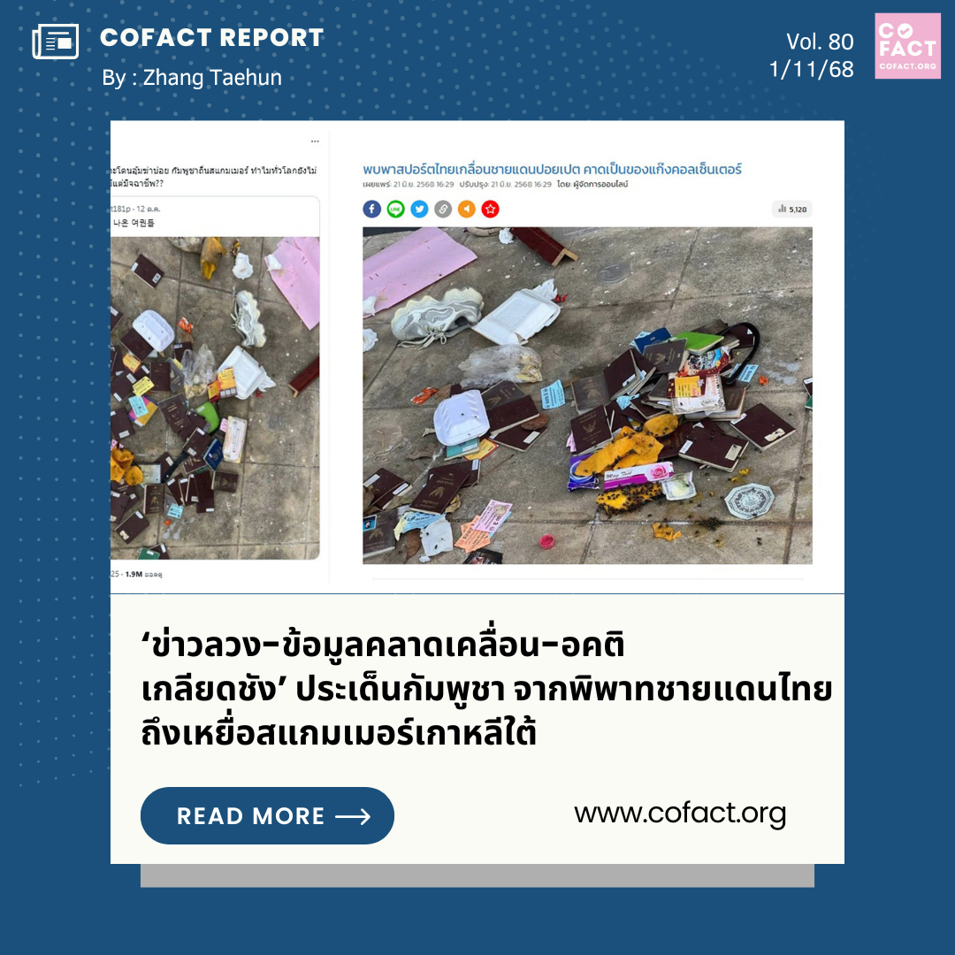 – ภาพเก่า – ข่าวลวง : พบตัวอย่างทั้งที่เป็นชาวเกาหลีใต้ เช่น วันที่ 12 ต.ค. 2568 ซึ่งในสังคมเกาหลีใต้เริ่มให้ความสนใจกับข่าวชาวเกาหลีถูกลักพาตัวและทำร้ายร่างกายจนเสียชีวิตในกัมพูชา บัญชีแพลตฟอร์ม X ชื่อ “JH의메모” โพสต์ภาพหนังสือเดินทางจำนวนมาก ซึ่งส่วนใหญ่เป็นของประเทศไทยถูกนำมาทิ้งไว้ โดยบรรยายเป็นภาษาเกาหลีว่า “캄보디아 쓰레기통에서 나온 여권들”(พบพาสปอร์ตในถังขยะกัมพูชา) แต่ไม่ได้ระบุว่าเป็นภาพที่ถ่ายไว้เมื่อใด