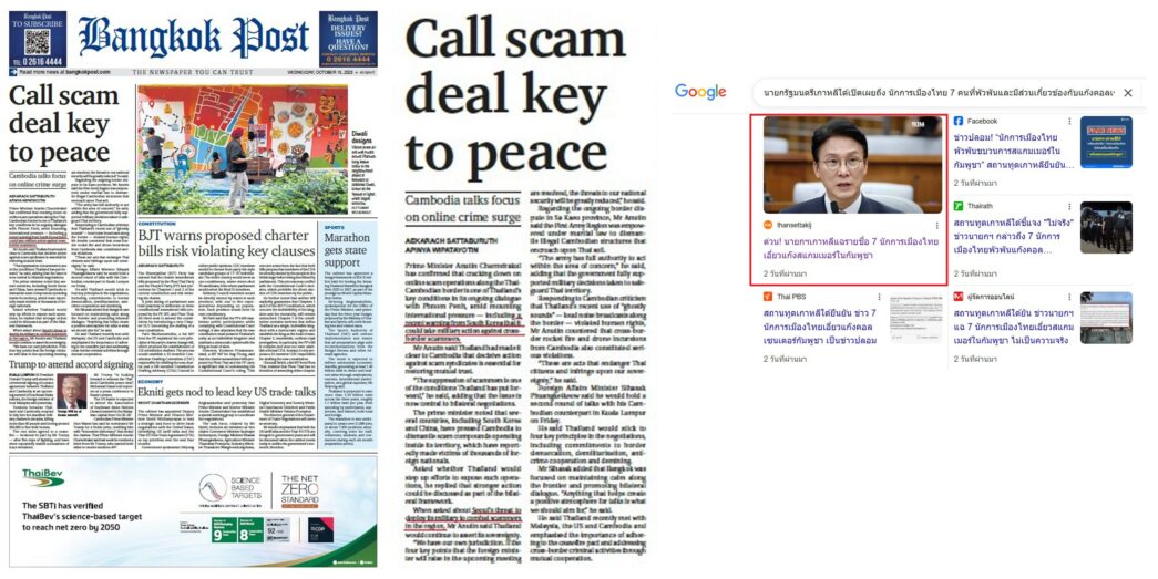 https://www.bangkokpost.com/thailand/general/3120817/call-scam-deal-key-to-peace-with-cambodia-thai-pm (Call scam deal key to peace with Cambodia : Thai PM : Bangkok Post 14 ต.ค. 2568)