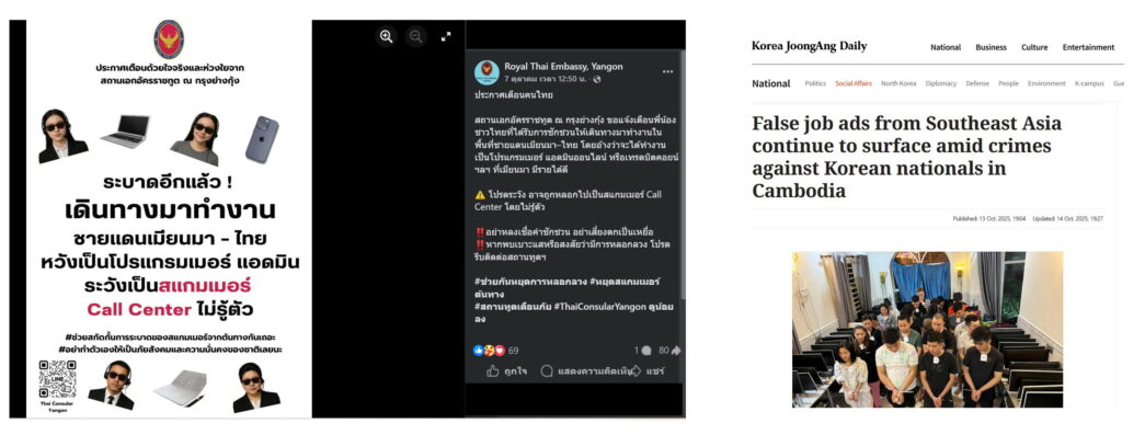 กรณีของเกาหลีใต้ก็เช่นกัน รายงานข่าวของ Korea JoongAng Daily วันที่ 13 ต.ค. 2568 ระบุว่า โฆษณาที่มีถ้อยคำประเภท “รายได้หลายล้านวอนต่อเดือน” หรือ “โอกาสงานต่างประเทศ” และมักอ้างว่าเป็นงานประเภทการตลาดหรือพนักงานขายทางโทรศัพท์ (หรือออนไลน์) สามารถพบเห็นได้ตามเว็บไซต์หางานที่เป็นภาษาเกาหลี และที่น่าห่วงคือขยายวงไปถึงเว็บไซต์ที่มีกลุ่มเป้าหมายเป็นนักศึกษาหรือบัณฑิตจบใหม่จากมหาวิทยาลัยที่กำลังเริ่มหางานทำ อย่างไรก็ตาม เมื่อผู้สื่อข่าวลองสอบถามไป บางแห่งก็กล้ายอมรับตรงๆ ว่าเป็นงานหลอกลวง แต่ก็ยืนยันว่าบริษัทไม่มีเรื่องการกักขังหรือทำร้ายร่างกาย