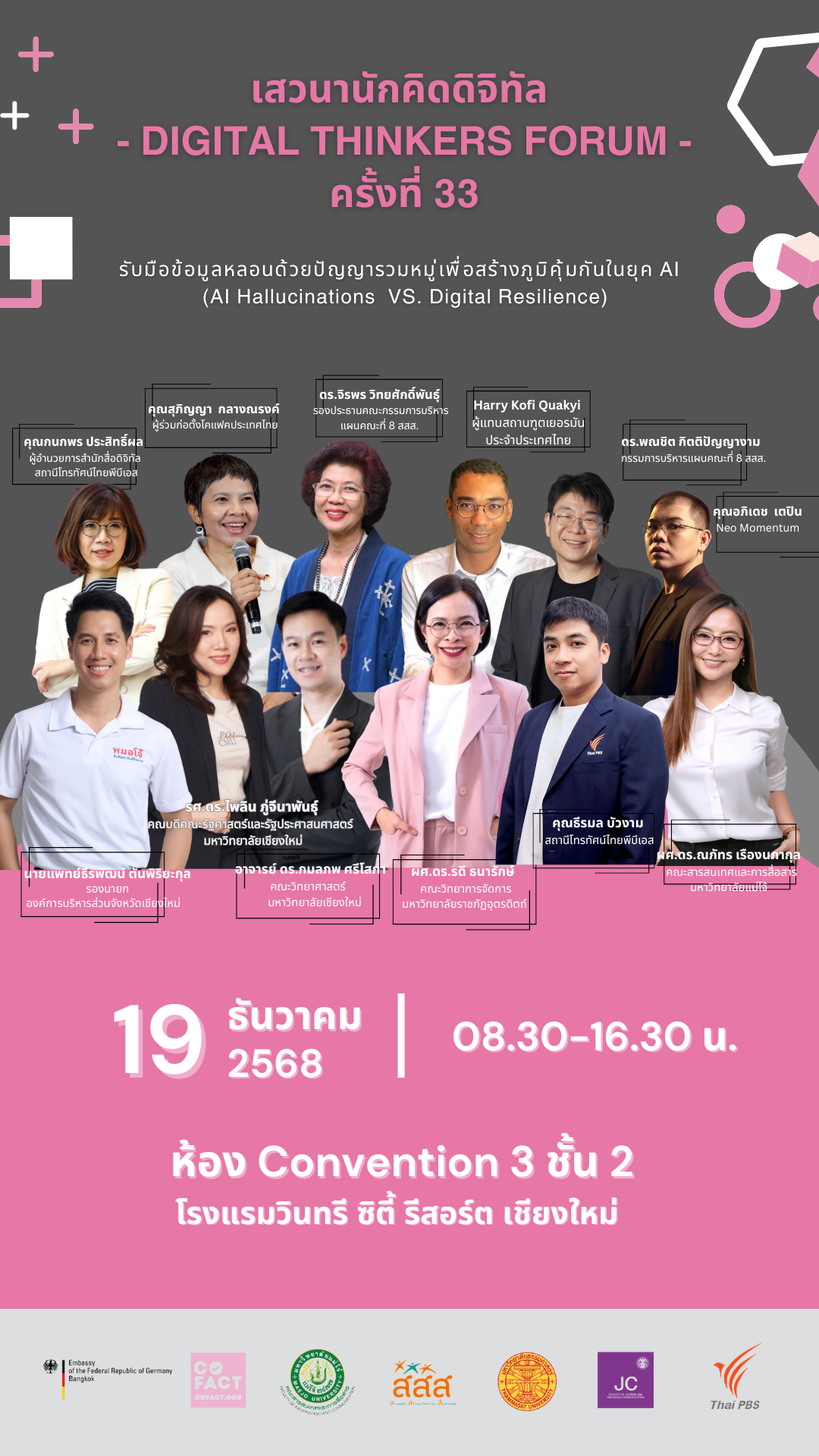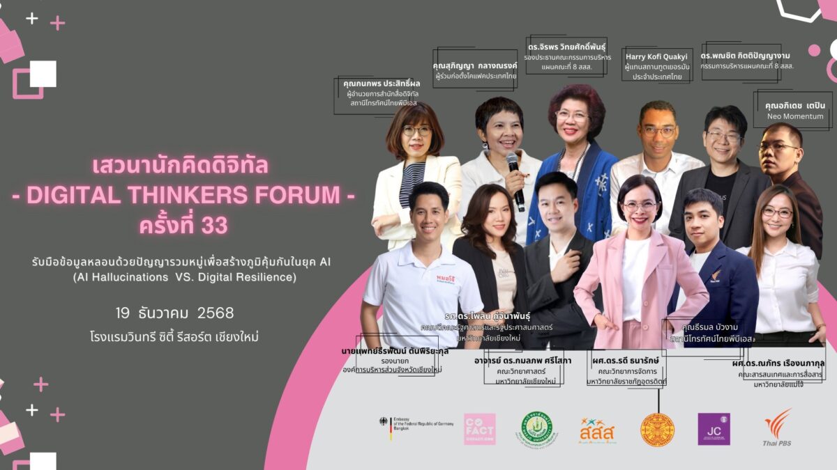 19 ธ.ค. 2568 สถานเอกอัครราชทูตเยอรมนีประจำประเทศไทย ร่วมกับ ภาคีโคแฟค (ประเทศไทย) มหาวิทยาลัยธรรมศาสตร์ โดยคณะวารสารศาสตร์และสื่อสารมวลชน มหาวิทยาลัยแม่โจ้ โดยคณะสารสนเทศและการสื่อสาร และ ThaiPBS จัดเวทีเสวนานักคิดดิจิทัล – Digital Thinkers Forum ครั้งที่ 33 ในหัวข้อ “รับมือข้อมูลหลอนด้วยปัญญารวมหมู่เพื่อสร้างภูมิคุ้มกันในยุค AI (AI Hallucinations VS. Digital Resilience)” โรงแรมวินทรี จ.เชียงใหม่