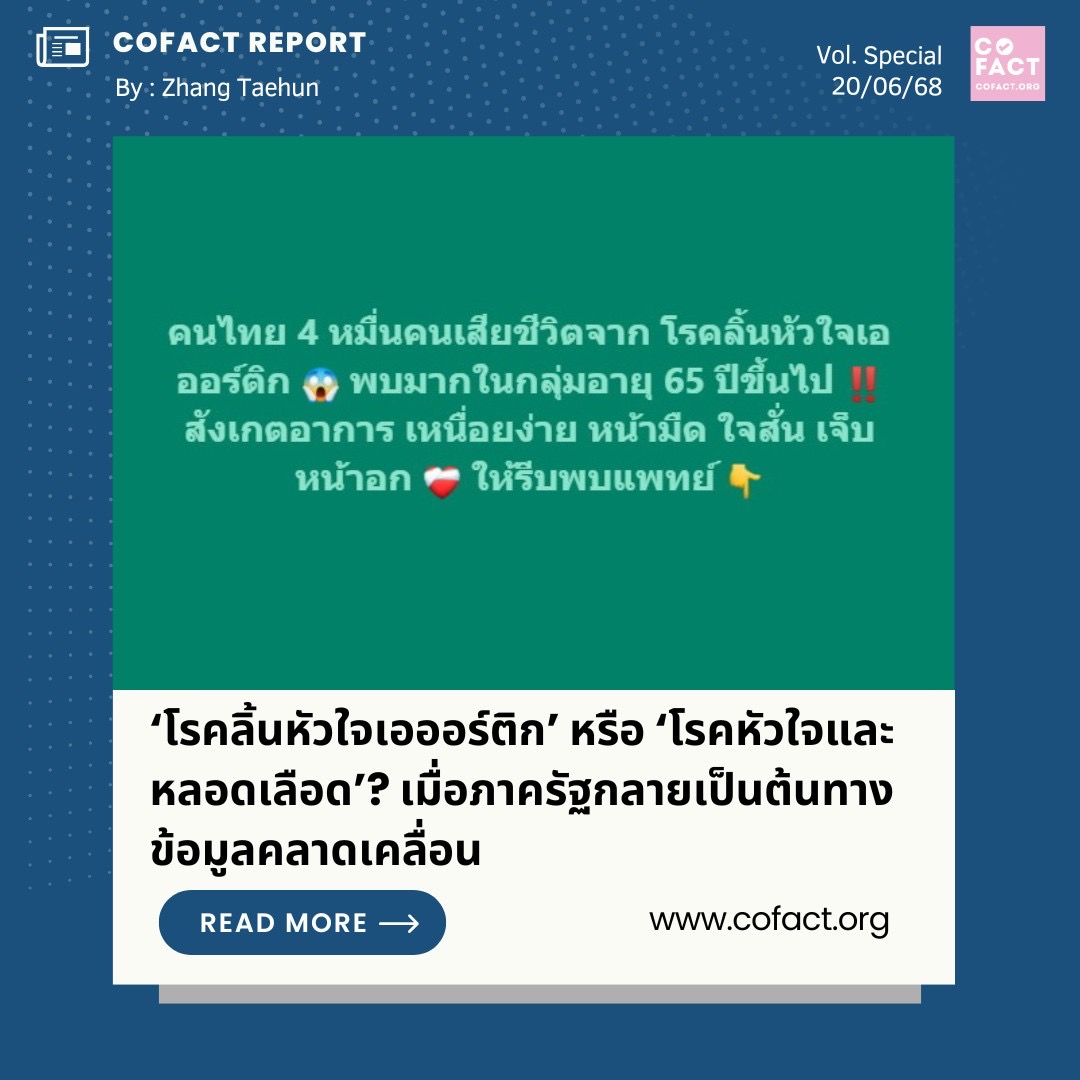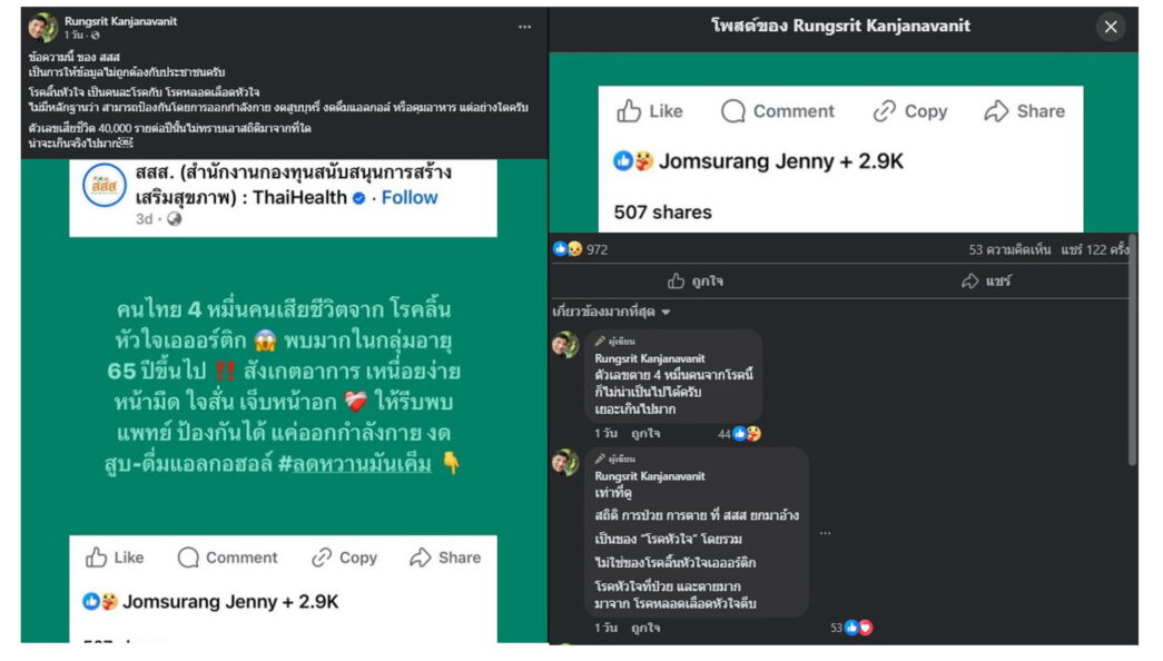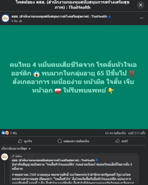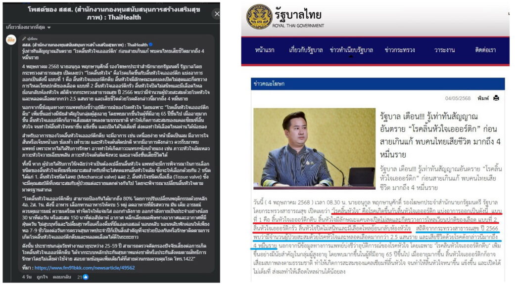 อย่างไรก็ตาม ในโพสต์ต้นทางของ สสส. ได้แชร์ข่าวห้วข้อ “รู้เท่าทันสัญญาณอันตราย ‘โรคลิ้นหัวใจเอออร์ติก’ ก่อนสายเกินแก้ พบคนไทยเสียชีวิตมากถึง 4 หมื่นราย” โดยอ้างข้อมูลจาก อนุกูล พฤกษานุศักดิ์ รองโฆษกประจำสำนักนายกรัฐมนตรี ที่ระบุถึงรัฐบาลโดยกระทรวงสาธารณสุข ดังนี้